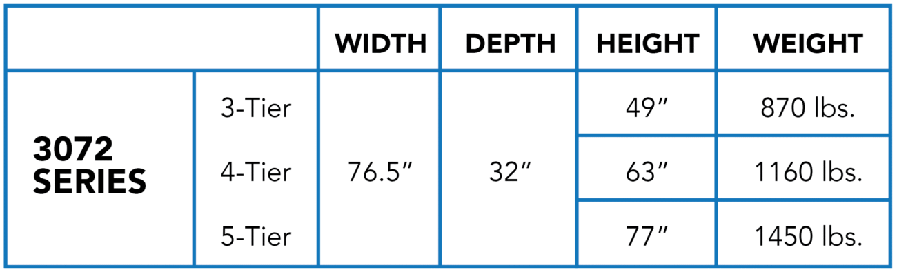 Safe Charge battery charging racks are available in 5-bay and 8-bay configurations and may be ordered as 3-tier, 4-tier, or 5-tier.